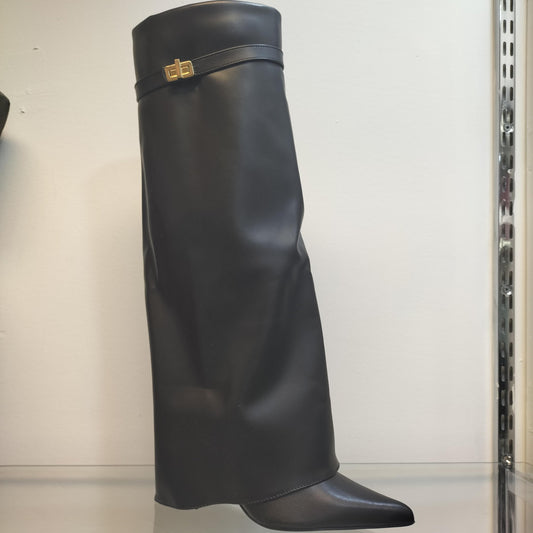 BLACK PU FOLD OVER BUCKLE DETAIL FULL INSIDE ZIP BLOCK HEEL KNEE HIGH SHARK BOOTS
